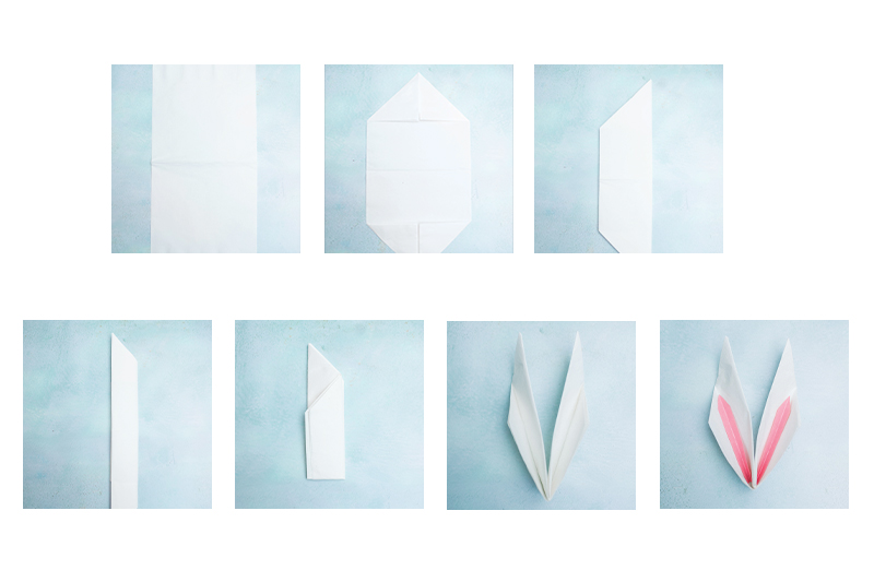 Turn plain cocktail napkins into cheerful bunny ears using the steps below. Set them in a clear plastic cup – adorned with a cotton ball for a bunny tail – for an extra pop.